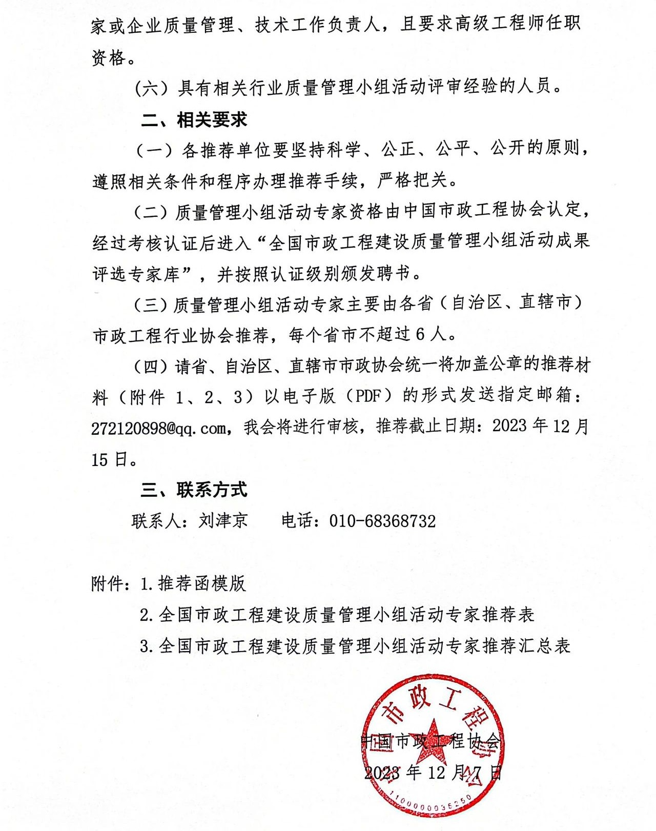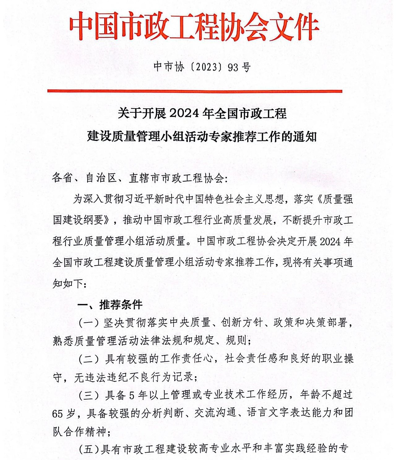 现将中国市政工程协会《关于开展2024年全国市政工程建设质量管理小组活动专家推荐工作的通知》转发给你们,请各会员企业按照推荐条件自愿申报,将推荐材料(附件1、2)以电子版(PDF)的形式发送至邮箱:50462998@qq.com,协会将择优推荐并统一报送至中国市政工程协会。